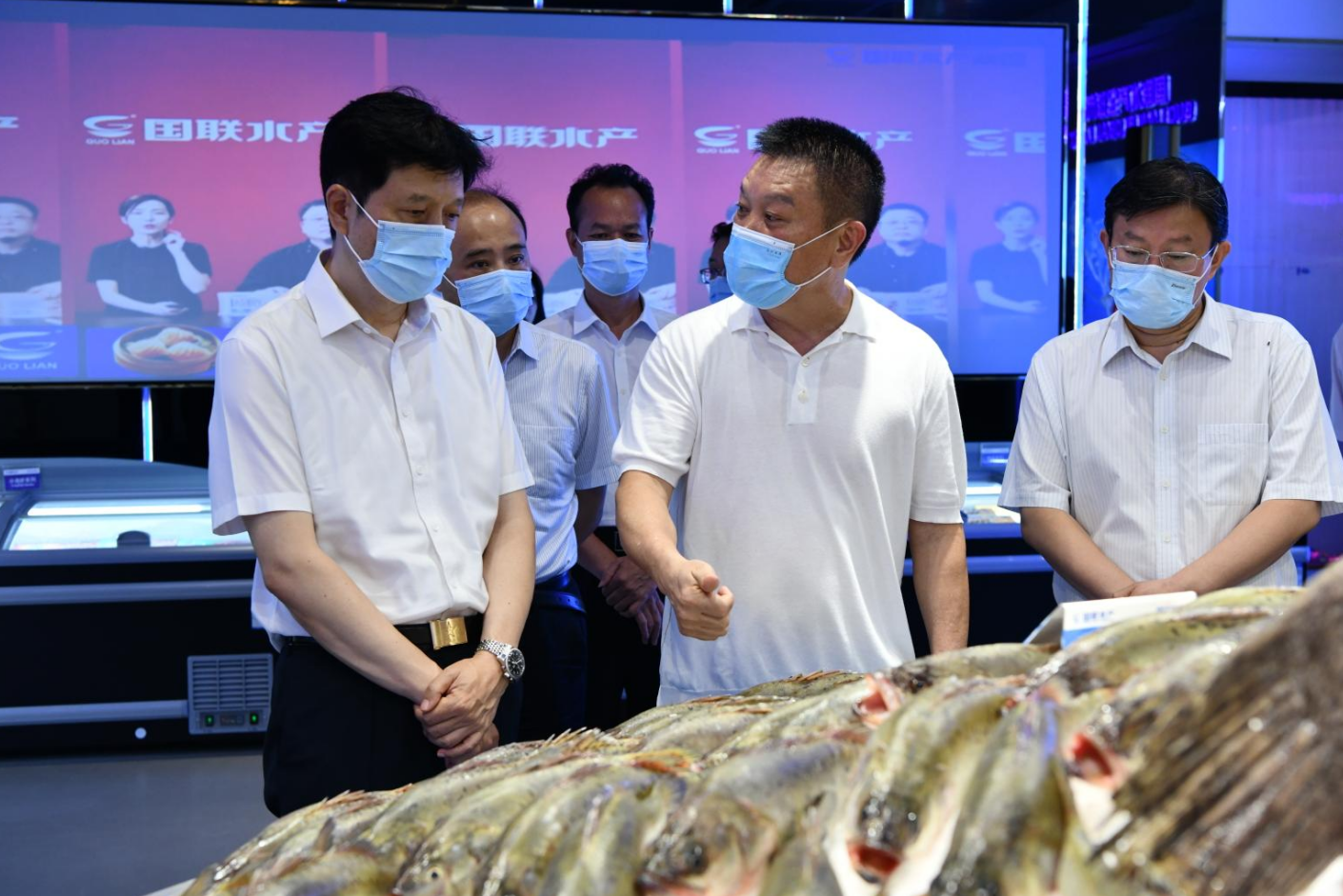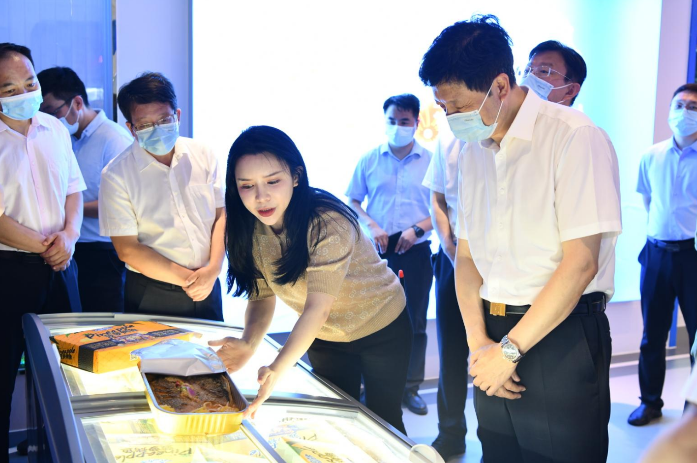 6月20日,宿州市委書記楊軍率調(diào)研組到國聯(lián)水產(chǎn)集團考察預制菜產(chǎn)業(yè)發(fā)展情況。宿州市委常委、宣傳部長、市委秘書長李紅,宿州市委常委、副市長祖鈞公,宿州市投資促進中心主任李惠海,宿州黃淮海智慧物流產(chǎn)業(yè)園工作專班負責人蔣立峰,長三角綠色農(nóng)產(chǎn)品(宿州)加工基地工作專班負責人王凌峰,湛江市委書記,市人大常委會黨組書記、主任劉紅兵,湛江市委副書記李勇毅,湛江市委常委、統(tǒng)戰(zhàn)部部長程鳳英,湛江市政府副市長何嘉旻,湛江市委秘書長梁錦榮,湛江市農(nóng)業(yè)農(nóng)村局黨組書記、局長,市委農(nóng)辦主任, 市鄉(xiāng)村振興局局長莫植貴,湛江市農(nóng)業(yè)農(nóng)村局黨組成員、副局長楊康平等領導共同參與調(diào)研。國聯(lián)水產(chǎn)集團董事長李忠率集團核心管理團隊,為調(diào)研組匯報我司在預制菜產(chǎn)品研發(fā)與產(chǎn)業(yè)發(fā)展推廣、農(nóng)漁產(chǎn)品加工技術創(chuàng)新等方面的最新成果。