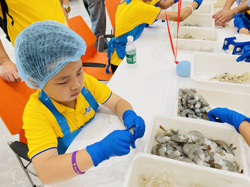 在一番參觀后,迎來了本次活動的重點環(huán)節(jié)——剝蝦微公益課堂,以“小朋友每剝好一條蝦,國聯(lián)水產(chǎn)集團(tuán)便捐出1元”的方式,為大家的愛心買單。